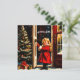 Holiday Card with a charming vintage-inspired Christmas graphic design. A cute little girl in red coat is standing at the doorstep . She is smiling .The starry night outdoors beautifully contrasts with the festive Christmas tree in the hall. It comes with the French Christmas wish " Joyeux Noel " . Using the versatile Zazzle tools you can effortlessly customise text and fonts.