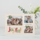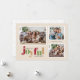 This cream coloured photo Christmas greeting card features the word "joyful" in a playful text and festive colours. The design offers space for three family photos on the front and custom text, on the back, for your own personal message.