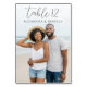 This wedding table card features a serene beach scene with two individuals standing closely together, capturing the relaxed and joyful mood of a seaside celebration. The design uses a natural color palette of sandy beige, light blue sky, and muted ocean tones to create a calming atmosphere. The typography includes a casual script font for "table 12" and clean sans-serif letters for names, offering a balanced and inviting look. Perfect for adding a personal touch to your wedding reception, this card combines minimalistic elements with a warm tone, making it ideal for an intimate gathering by the shore.