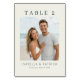 This wedding table card features a clean, minimalistic design with ample white space and a centered layout. The color palette includes neutral beige tones complemented by blues from the beach photo, creating a serene and inviting atmosphere. Elegant serif typography is used for the names, while a simple sans-serif font displays the date, adding to the sophisticated aesthetic. The representation style captures a candid moment on the beach, conveying joy and warmth, making it perfect for a memorable celebration.