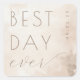 This wedding sticker features a minimalist and elegant design with a soft, watercolor background in shades of beige and light brown. The phrase "BEST DAY ever" is prominently displayed using a mix of uppercase serif letters and flowing cursive script, creating a sophisticated yet personal touch. The gentle hues and fluid typography evoke a romantic and celebratory mood, perfect for commemorating your special day. The serene atmosphere and timeless style make it an ideal choice for capturing the joy and warmth of your wedding celebration.