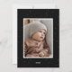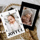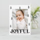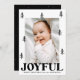 Festive photo Christmas card featuring your vertical photo surrounded by black hand-drawn pine trees with a white background. "Joyful" is displayed in bold black lettering with your custom greeting and family name shown below. The joyful Christmas card reverses to display an additional photo and a black background with subtle white dots.