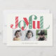 These 7" x 5" flat holiday cards feature placeholders for three (3) of your favourite photos, name and year. The non-editable greeting is, "Joyful" in large decorative letters of red and green.