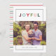 Share a modern holiday hello with this clean, gallery-style holiday card featuring the bold JOYFUL headline in cheerful seasonal colors. A thin black frame keeps your photo the star, while the minimal layout feels fresh and timeless. The back features a coordinating multicolor stripe pattern for a playful, polished finish. Perfect for family photos, couples, and sweet “new baby” holiday snapshots.