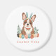 This magnet features a minimalist design, showcasing a charming French Bulldog wearing bunny ears amidst a colourful array of Easter eggs. The phrase "Easter Vibe..." adds to the festive atmosphere.
