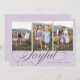 Minimal and modern holiday photo template card featuring 3 photos with a script text that says "joyful" at the bottom. You can also add another picture and message on the back. The background is purple.