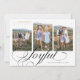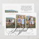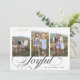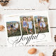 Minimal and modern holiday photo template card featuring 3 photos with a script text that says "joyful" at the bottom. You can also add another picture and message on the back.
