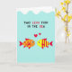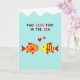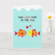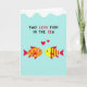 This card shows two bright fish facing each other on a smooth cyan background, bordered along the top by a white scalloped edge that suggests the ocean’s surface. One fish is orange with yellow polka dots and red fins, leaning in with an eager, affectionate look toward the other. The second fish is sunny yellow with vertical red stripes and red fins, mirroring the pose so they seem to meet in the middle like a gentle underwater kiss 🥰. Between their open mouths, two small red hearts float as if drifting on a current, adding a romantic touch without needing anything else ❤️. Above them, the phrase “TWO LESS FISH IN THE SEA” sits centered near the top in rounded sans-serif lettering. Most of the text is black, while “LESS” and “SEA” are picked out in bright red to echo the hearts and fins. The overall layout keeps the fish centered under the line of text, with the red accents repeating across the hearts, fins, stripes, and highlighted words.