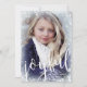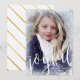 Christmas card inspired by winter wonderland, with a frosted frame of powder snow and snowflakes around your photo of choice. Across the lower half, joyful is written in a large script. The back features diagonal stripes in faux gold foil.