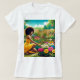 A vibrant scene of an African American woman in a bright yellow sundress planting flowers in a lush garden. Surrounded by colourful daisies and tulips, she kneels beside a flower bed under a clear blue sky, capturing the peaceful essence of a sunny day spent gardening.