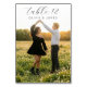 This wedding table card features a romantic and whimsical design with a photograph of two individuals dancing in a field filled with white flowers, bathed in the warm glow of sunrise or sunset. The layout is centred with ample negative space, creating an open and joyful atmosphere. Elegant script typography at the top indicates "table 12," while a smaller serif font lists names, adding a touch of formality to the charming scene. The natural colour palette of greens, whites, and golden hues enhances the serene and intimate mood, making it perfect for celebrating love and connection at your special event.