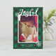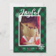 This holiday photo card features your favourite family photo, The word "Joyful" in white in a hand lettered typography against a cosy green buffalo plaid background accented with white snowflakes. Customise with your family name. The back shows a pattern of green buffalo plaid with white snowflakes all over.