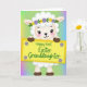 This card features a stylized lamb-like character with fluffy white fleece, rounded shapes, dark expressive eyes, rosy cheeks, and a small smile that feels like it’s meant for someone close. A floral crown of yellow and soft purple blossoms with green leaves rests on its head, adding a gentle, affectionate touch 🌷. Behind it, the background fades vertically from spring green into light lavender and then sky blue, creating a calm, airy setting. The character stands upright with tiny dark hooves showing and holds a bright yellow rectangular banner across its body, as if presenting it to a dear friend or loved one 🐰. The banner has a scalloped edge and a couple of small purple flower accents that echo the crown. Centered on the banner is a short holiday message in green lettering, placed to read clearly against the yellow, with the words filling most of the sign. Soft, even lighting keeps the fleece bright and the pastel gradient smooth, while the yellow banner stays the strongest color on the page. The scalloped border and the small purple blossoms sit along the banner’s edges, with the green text centered across the middle.