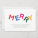 Step into a world of minimalist charm and vibrant joy with this delightful holiday design featuring your party details alongside colourful bold letters that spell out the word "Merry" using playful typography.