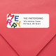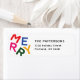 Step into a world of minimalist charm and vibrant joy with this delightful holiday design featuring your family name and address alongside colourful bold letters that spell out the word "Merry" using playful typography.