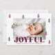 Festive photo Christmas card featuring your horizontal photo surrounded by merlot-purple hand-drawn pine trees with a white background. "Joyful" is displayed in bold merlot-purple lettering with your custom greeting and family name shown below. The joyful Christmas card reverses to display an additional photo and a merlot background with subtle white dots.