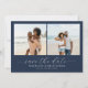 This wedding save the date card features a split layout with two beach-themed photos, creating a relaxed and joyful atmosphere. The deep navy blue background contrasts beautifully with the lighter tones of the images, while elegant cursive and clean sans-serif typography adds a touch of sophistication. Perfect for couples looking to announce their special day in a stylish yet casual way, this design captures the essence of seaside romance and leisurely celebrations.