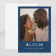 This wedding save the date features a romantic and intimate photograph of two individuals, set against a deep navy blue background that enhances the warmth of the image. The layout is clean and vertically oriented, with ample negative space to emphasize the subjects. Elegant serif typography highlights the date and names at the bottom, creating a focal point while maintaining a balanced composition. The design captures a candid moment of joy and connection, making it perfect for announcing an upcoming celebration.