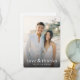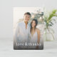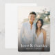 These wedding thank you cards feature a warm, romantic design with a central photograph of two individuals in formal attire against a softly blurred outdoor backdrop. The colour palette is dominated by neutral tones like beige and light grey, complemented by hints of green and blue, creating a serene atmosphere. Elegant cursive typography reads "love & thanks," while the names are displayed in clean, uppercase sans-serif font, adding clarity and sophistication. The overall mood is joyful and heartfelt, perfect for expressing gratitude after a special celebration.