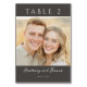 This wedding table card features a modern and elegant design with a portrait layout, divided into two sections. The top section highlights the table number in bold, white sans-serif font against a dark gray background, while the bottom section includes an intimate photo of a couple set against a warm, golden outdoor backdrop. Below the image, names are elegantly scripted, followed by a simple serif font for the date, all framed within a cohesive dark gray border. The overall color palette of neutral tones creates a balanced and inviting aesthetic, perfect for adding a touch of romance to your special day.