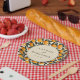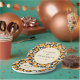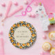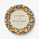 This vibrant wedding plate features a playful pattern of bright orange fruits and deep green leaves on a soft beige background, creating a lively and inviting atmosphere. The design is centred around an elegant circular frame with classic serif typography, making it perfect for personalisation. Ideal for celebrating joyous occasions, the cheerful motif and modern style add a festive touch to any event.