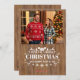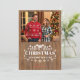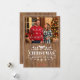 This custom photo greeting card embodies cosy, rustic holiday comfort. The design is split between a warm, inviting top photo panel and a richly textured bottom message panel. The photo, framed by a dark border, captures a couple (or family) looking festive against a blurred backdrop of sparkling Christmas lights and a decorated tree. Below the image, the card features a stunning wood-grain texture in a warm brown tone. The message "WISH YOU A MERRY CHRISTMAS AND HAPPY NEW YEAR" is displayed in beautiful white typography, accented by charming winter icons, reindeer, and swirling decorative flourishes. The names "Romeo & Juliet" complete the sentiment at the bottom, delivering a warm, homey holiday greeting.