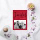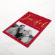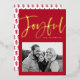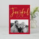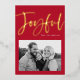 Modern foil holiday card featuring "Joyful" hand-lettered gold foil script with a festive red background. Personalise the front of the card by adding your favourite horizontal photo and name. The reverse side of the card features a red and white modern Christmas tree pattern.