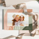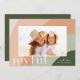 A chic and elegant holiday card design featuring a single horizontal or landscape-orientated photo in a unique arched layout, framed by organic stripe shapes in soft shades of light clay and hunter green. "Joyful" appears beneath your photo in understated type, with the year alongside. Personalise with your family name at the lower right for the perfect finishing touch to these nature-inspired Christmas 2021 photo cards.
