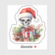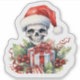 A whimsical skeleton wearing a festive holiday Santa hat poses cheerfully among colourful presents and vibrant green holly. This playful blend of spooky and cheerful evokes the spirit of Christmas, celebrating the season with a unique twist.