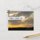 This postcard features my original photography. This midwestern sunset has a silhouette of trees at the horizon. The beautiful gray and orange clouds give way to the setting gold sun, which is peaking through. The text on this card reads "Today I Choose Joy." You can personalize this text with your own phrase, a name or special occasion. On the back of the postcard there is a smaller version of the sunset photo alongside of the return address. Also there are ruled lines on the back for an address. This postcard can be customized.