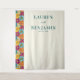 This wedding backdrop features a vibrant floral pattern on the left, with stylised flowers in deep reds, bright oranges, yellows, and blues creating a lively border. The right side is clean and white, providing a perfect contrast for the elegant serif typography that displays customisable names and date in dark teal. The design blends contemporary minimalism with romantic elements, making it ideal for celebrating your special day with joy and sophistication.