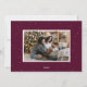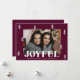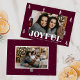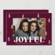 Festive photo Christmas card featuring your horizontal photo surrounded by white hand-drawn pine trees with a merlot-purple background. "Joyful" is displayed in bold white lettering with your custom greeting and family name shown below. The joyful Christmas card reverses to display an additional photo and a dark purple background with subtle white dots.