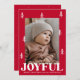 Festive photo Christmas card featuring your vertical photo surrounded by white hand-drawn pine trees with a red background. "Joyful" is displayed in bold white lettering with your custom greeting and family name shown below. The joyful Christmas card reverses to display an additional photo and a red background with subtle white dots.