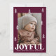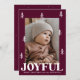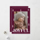 The Joyful Trees Wine 2 Photo Holiday Card features your vertical photo framed by elegant white hand-drawn pine trees set against a rich wine background. Bold white "Joyful" lettering highlights your personalised holiday greeting and family name below. The card’s reverse showcases an additional photo on a matching wine background accented with subtle white dots, making this custom Christmas card a stylish and memorable way to share warm holiday wishes.