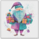 A cheerful, whimsical Santa Claus adorned in vibrant violet hues carries an array of colourful presents, embodying the spirit of Christmas.