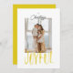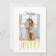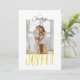 A one photo flat holiday card features watercolor brush lettering of the word "Joyful".