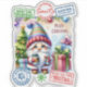 A colourful Christmas sticker showcases a whimsical elf with a joyful expression, holding a warm drink and presents.