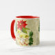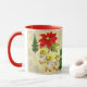 Decorate for the holidays with this cute, vintage Christmas mug featuring joyous, dancing cherubs or baby angels in cute red polka dot nightgowns waving a bright red poinsettia on a background of Christmas trees and snowflakes. This cute Christmas pillow is a great Christian, Christmas decor piece, in an old fashioned style, with a gold background, green Christmas trees, bright red poinsettia, and cute baby angels with gold halos and vintage snowflakes.