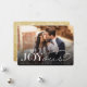 This modern and elegant holiday/christmas wedding announcement card features the word 'Joyous' in a mix of classic serif and whimsical calligraphy script with the couple's monogram embedded within a unique diamond ring overlaying a full bleed photo. The back of the card has a faux gold glitter image background with white snow dots pattern.