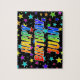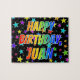 This lively and fun birthday-themed jigsaw puzzle design features the message "HAPPY BIRTHDAY, JUAN" with the characters having a colorful rainbow spectrum inspired gradient pattern, in addition to an exciting field of stars background pattern. A colorful puzzle like this might be a fun way to send birthday wishes to somebody named Juan. [~Z0000468]