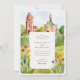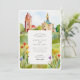 Celebrate your union with this exceptionally artistic wedding invitation, featuring a beautiful watercolor depiction of the iconic Mathildenhöhe in Darmstadt, Germany – a jewel of the Jugendstil (Art Nouveau) movement. The front captures the distinctive architecture, including the Wedding Tower (Hochzeitsturm) and the Russian Chapel, rendered in soft, expressive watercolors that highlight their unique forms and characteristic turn-of-the-century charm. Cheerful, stylised wildflowers in vibrant red, orange, yellow, and purple gracefully frame the invitation details, adding a touch of natural beauty to the architectural splendour.
