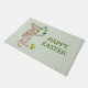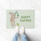 The Easter Bunny juggles the Easter eggs while the little chicken is the audience.