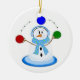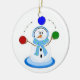 A cool snowman juggling coloured balls of red, blue and green. All wrapped up in his earmuffs and scarf.