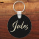 Ein sehr schöner edler personalisierter Button Schlüsselanhänger im whitegold Lettering Look auf schwarz für Jules.