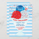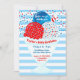This fun and playful invitation features a sundae with scoops of ice cream in bright red, dark blue and light grey with sprinkles. The background has blue and white stripes. The text combines bold and sans serif fonts for a stylish and modern look. This is perfect for a July 4th themed birthday party.