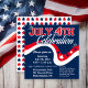 July 4th Stars Patriotic Celebration in a Red, White and Blue design. Features the words "July 4th Celebration" in big bold red and white text across the top with a wave across the centre in red and white with blue and white stars. The back features a red and blue star pattern on a white background. Original design by Holiday Hearts Designs (all rights reserved).
