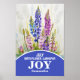 A vibrant watercolor of larkspurs and water lilies. The larkspurs have tall, spiky stems with bright purple and blue flowers, while the water lilies float serenely with white and pink petals on a subtle water background. The scene feels summery and peaceful. personalised with name, bible verse, this September Birth Month Flower Art is the perfect birthday gift for family members, friends, colleagues and clients. Matching July gifts are available, as are gifts for every other month.