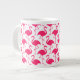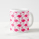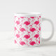 Pink flamingo jumbo coffee and beverage mugs including a cute flamingo all over pattern in pink and white. Drink your favourite coffee, tea, or beverage in style with background colour and a touch of tropical nature.