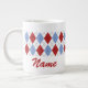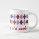 This 20 oz. (ounce) jumbo size mug has a "My Old Socks" saying written in dark red lettering and a customisable text field for a name. The design features a dark red and blue knitted argyle sock motif. A gift that is perfect for you or for any coffee drinker.