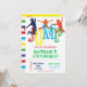 This jump house birthday party invitation is bright and cheerful and fun, just like a jump place party. Primary colours and bold stripes with jumping silhouettes create this one of a kind jump party invite.